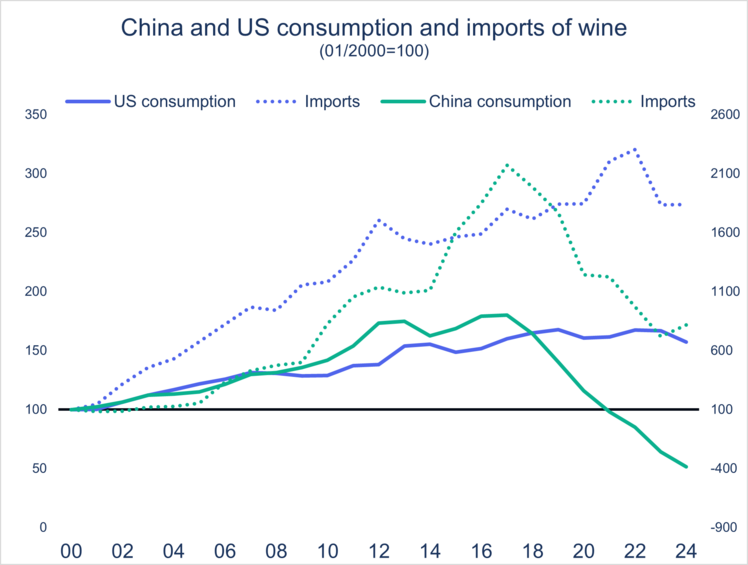 La producción y el consumo mundial de vino han caído ambos cerca de un 10% en diez años. Pero el descenso es mucho más acusado en Europa, donde el consumo ha disminuido un 25% desde 2000. Francia ha perdido su estatus de primer productor mundial en favor de Italia, y la demanda continúa desplomándose. Para 2025, se espera que el consumo mundial alcance un mínimo histórico de 214 millones de hectolitros.