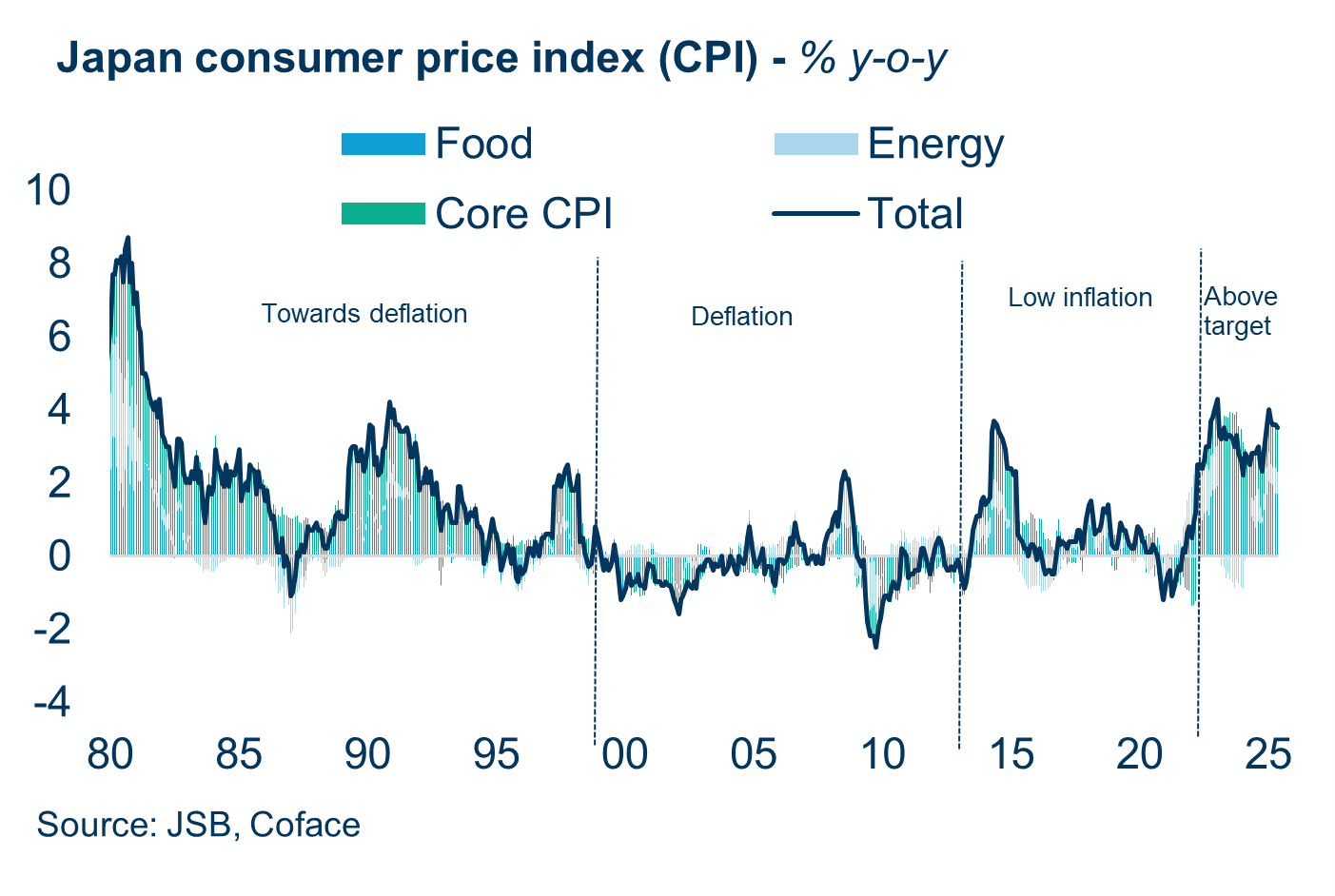 Over the past three decades, occasional inflationary episodes occurred, mostly driven by temporary shocks such as oil price spikes or consumption tax hikes, without lasting pull from domestic demand. This has changed since 2022, when inflation consistently exceeded the Bank of Japan’s 2% target, fueled initially by rising import costs and yen depreciation.