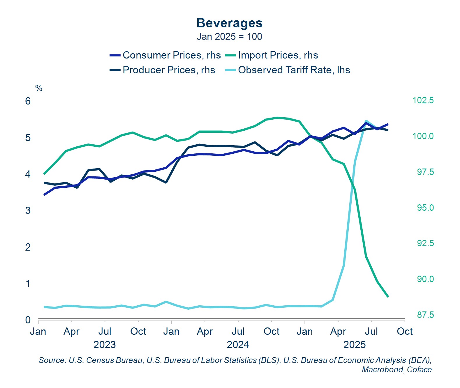 Bebidas: La industria de bebidas es uno de los pocos casos claros de transmisión a los exportadores, en especial en licores, donde los precios de importación han caído 22% desde marzo.