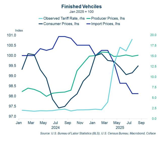 - Más allá de la inflación al consumidor, los importadores estadounidenses están absorbiendo gran parte del costo, con una parte trasladada a los exportadores extranjeros.
