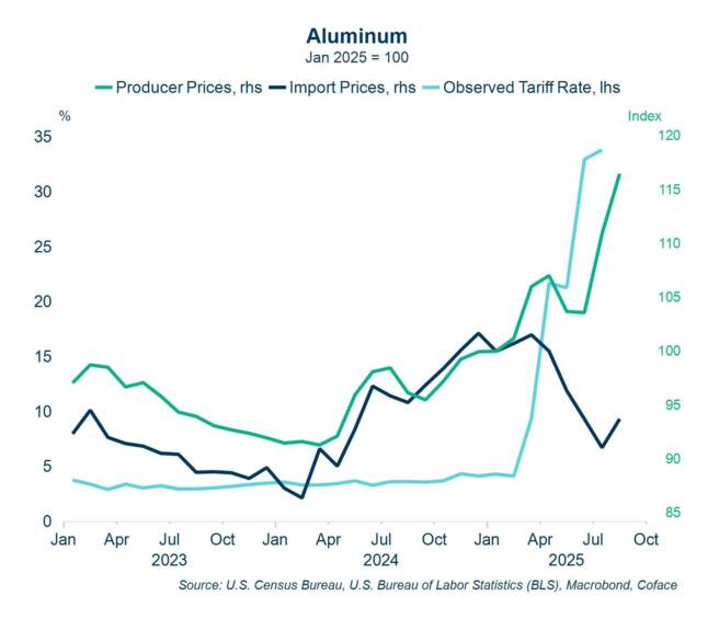 Antes de los nuevos aranceles, los precios de importación y de productor se movían casi en paralelo. Este año, los precios de productor subieron mientras los de importación cayeron. EE. UU. depende de importaciones para aproximadamente la mitad de su aluminio, la mayoría de Canadá. El arancel del 50% provocó una contracción abrupta de importaciones, demasiado rápida para que la oferta local alcanzara, generando una desconexión entre los mercados de EE. UU. y el global. Esto ha resultado en ganancias extraordinarias para los productores primarios estadounidenses, pero ha creado presión de costos en sectores como construcción, aeroespacial, empaques, bienes duraderos y maquinaria.